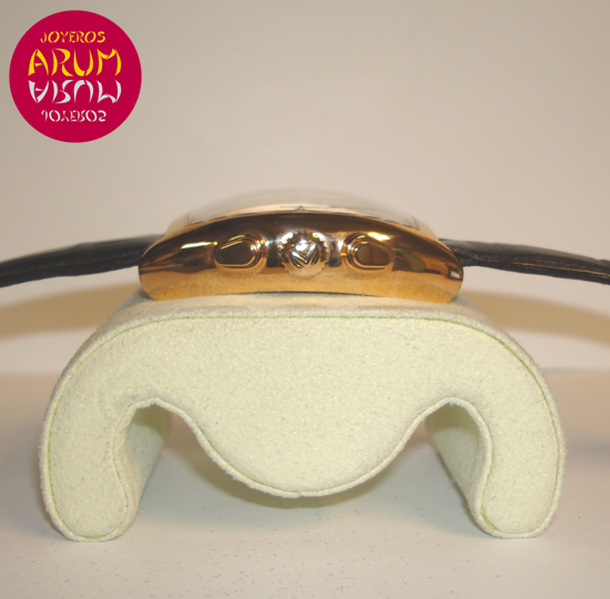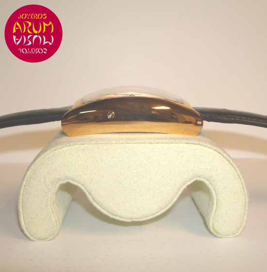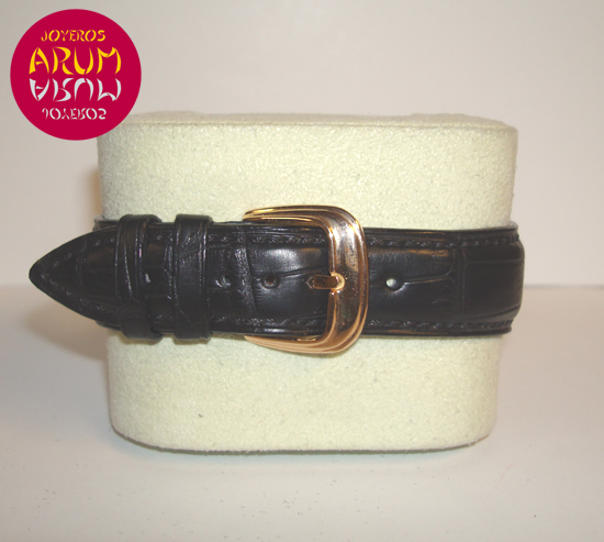 Description :pink gold, white guilloche dial, smooth bezel, sapphire crystal, automatic movement, blued steel hands, chronograph, three indicators on the dial, seconds, minutes, hours, date between four and five, screw crown and two buttons at right, diameter 36 mm by 50 mm, waterproof 30 meters, black leather strap, rose gold buckle closure.