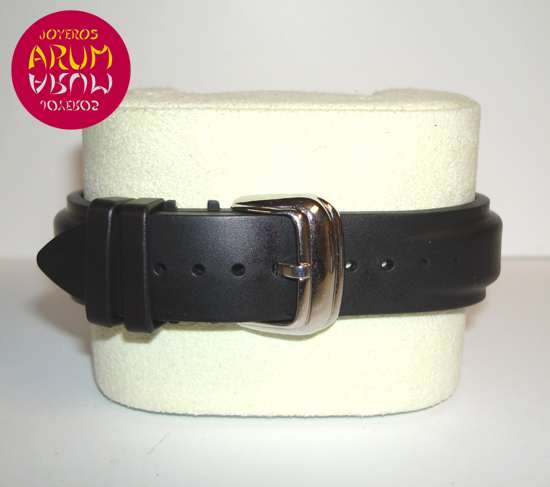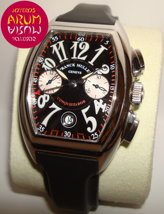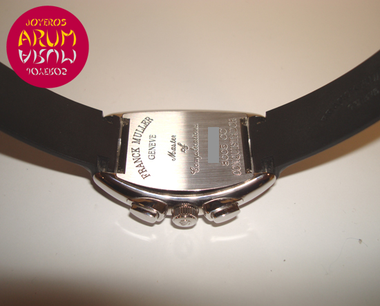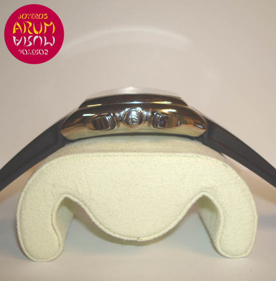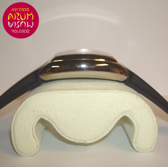 Description :steel, black guilloché dial with arabic numbers, sapphire crystal, automatic movement, chronograph, two indicators on the dial, minute indicator at three, hour indicator at nine, date at six, handles and luminescent dial, screw crown and two buttons at right, diameter 35 mm by 49 mm, rubber strap, buckle closure.