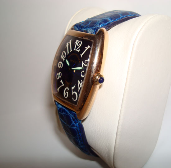 Description :lady watch, pink gold, sapphire crystal, quartz movement, blue dial, screw crown with stone, luminescent handles, diameter 24 mm by 33 mm, blue leather strap, buckle closure.