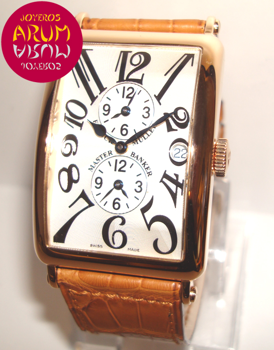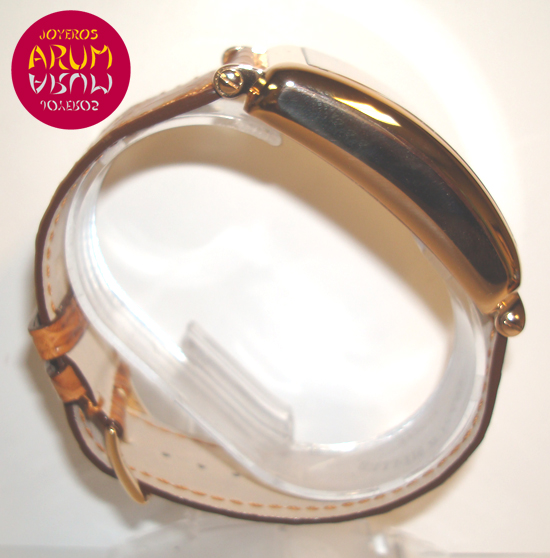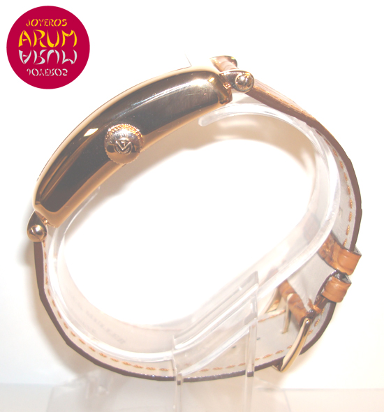 Description :rose gold, silver guillose dial with arabic numbers, smooth bezel, sapphire crystal, automatic movement, three time zones, date at three, screw crown, diameter 32.5 mm by 45 mm, waterproof 30 meters, brown leather strap, buckle closure.