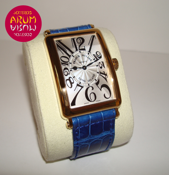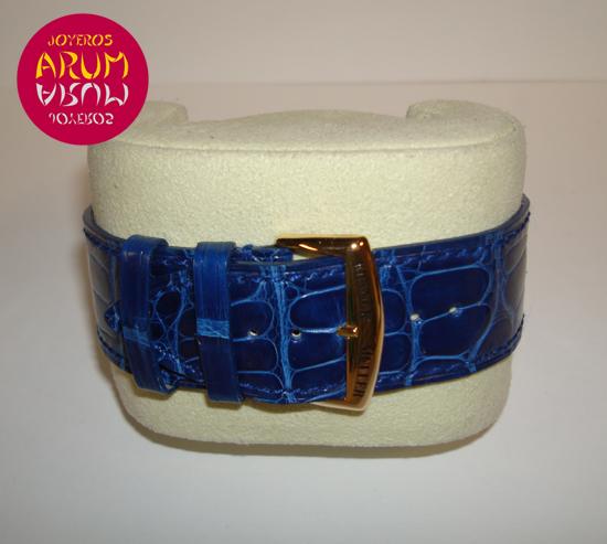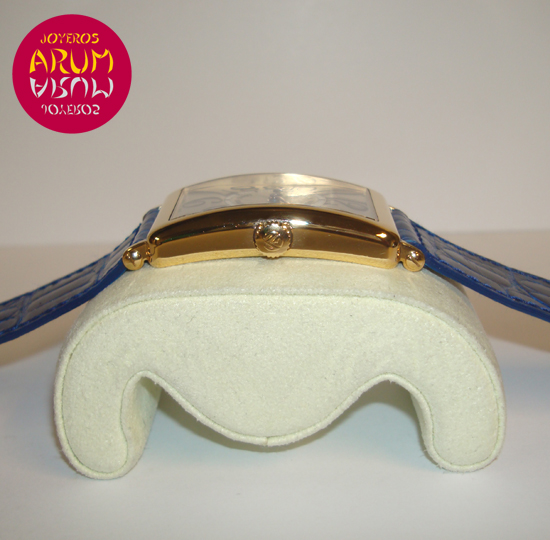 Description :yellow gold, silver dial with arabic numerals, sapphire crystal, automatic movement, screw crown, diameter 30 mm by 42 mm, blue leather strap, buckle closure, year 2008.