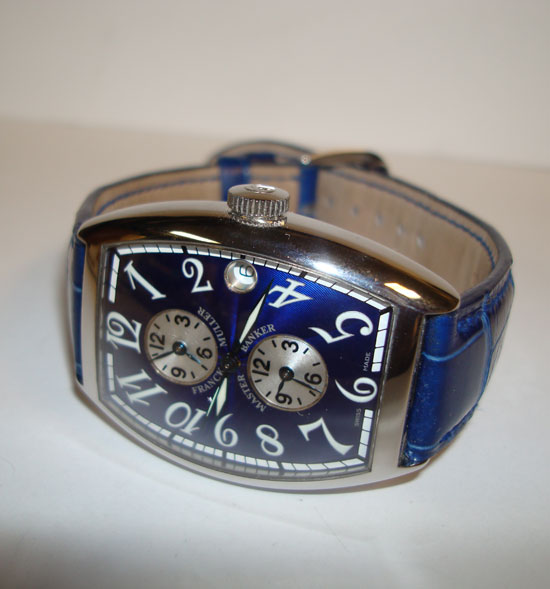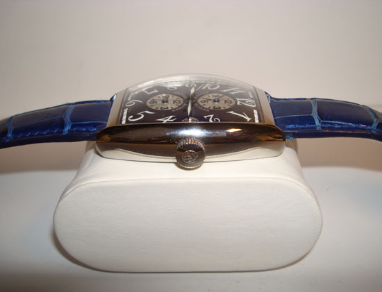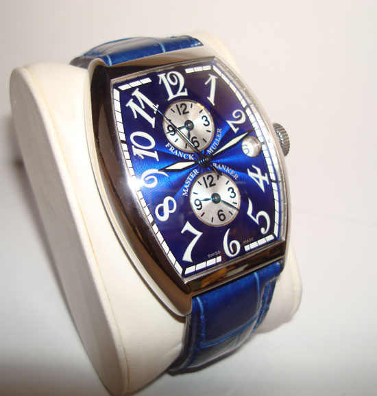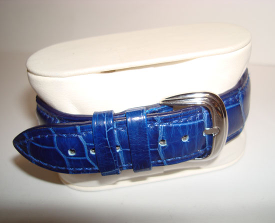 Description :steel, blue dial, sapphire crystal, automatic movement, 3 time zones, date at three, handles and lumiscentes dial, center seconds, screw crown, diameter 34 mm, blue leather strap, steel buckle closure, year 2009.