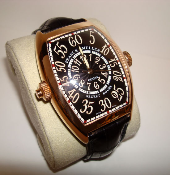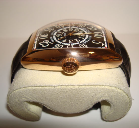 Description :pink gold, black dial with arabic numerals, sapphire crystal, automatic movement, handles in starting position in twelve o’clock, the left button that activates real time, screw crown on the right, handles and luminescent dial, diameter 39 mm without crown and push-button, black leather strap, rose gold buckle closure.