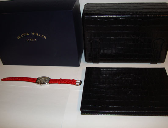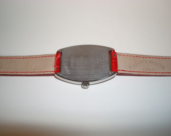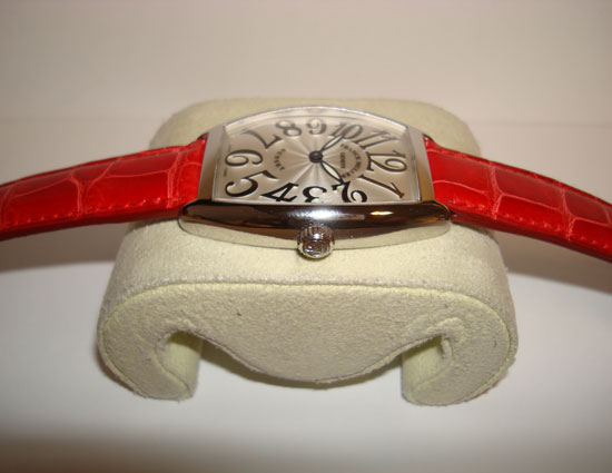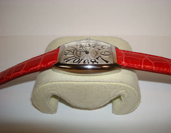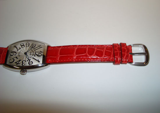 Description :steel, white dial with arabic numerals, sapphire crystal, quartz movement, luminescent handles, screw crown, diameter 30 mm by 42 mm, red leather strap, steel buckle closure.