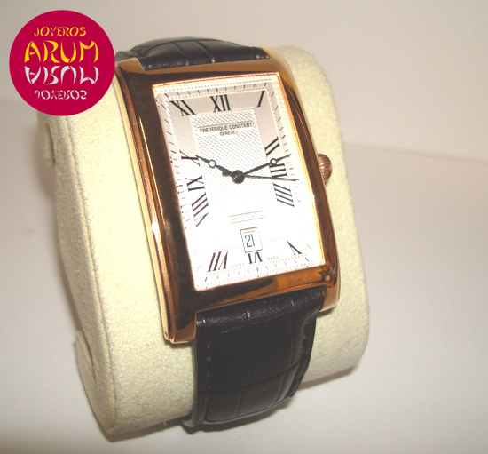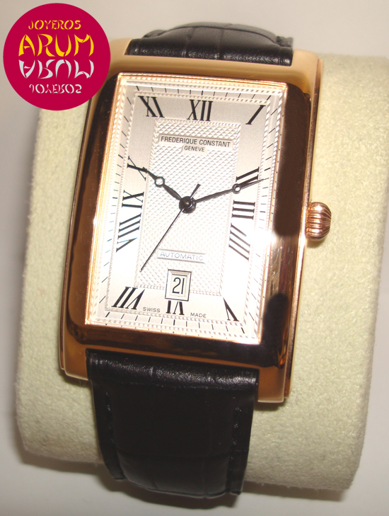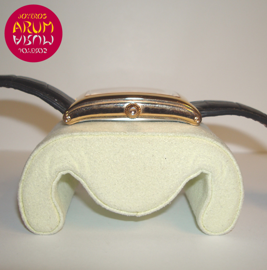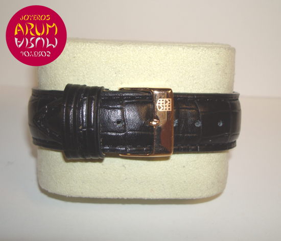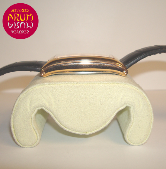 Description :gold plated steel, white guilloche dial, smooth bezel, sapphire crystal, automatic movement, central second, date at six, screw crown, diameter 31 mm by 47 mm, waterproof 60 meters, black leather strap, buckle closure.