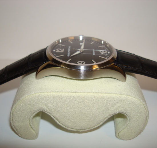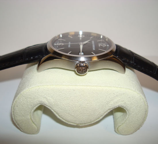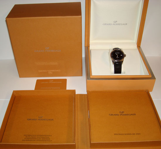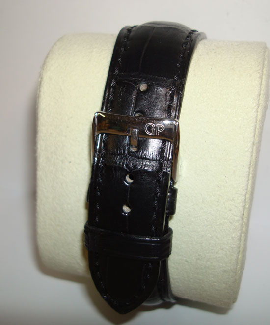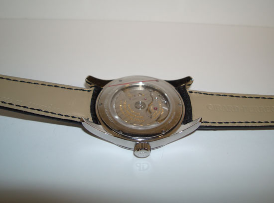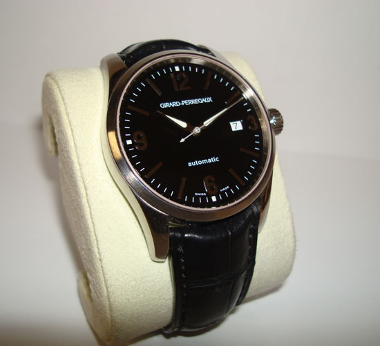 Description :steel, black dial, sapphire crystal, automatic movement, center seconds, luminescent handles indicators, date at three, screw crown, transparent back, diameter 38 mm, waterproof 30 meters, black leather strap, buckle closure original Girard Perregaux , year 2009.