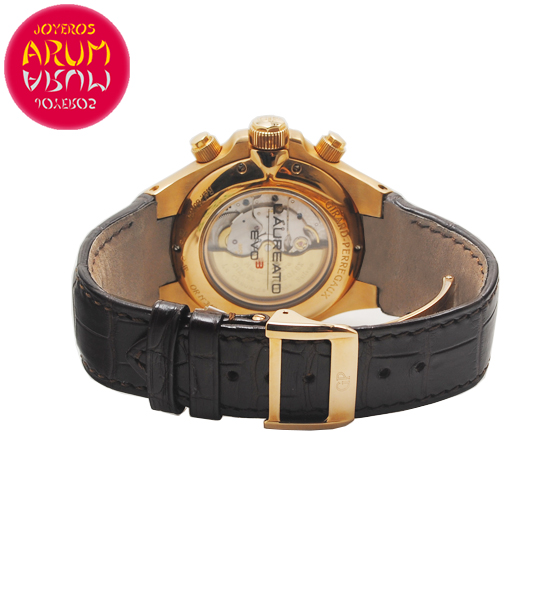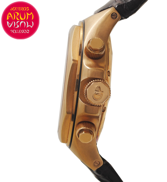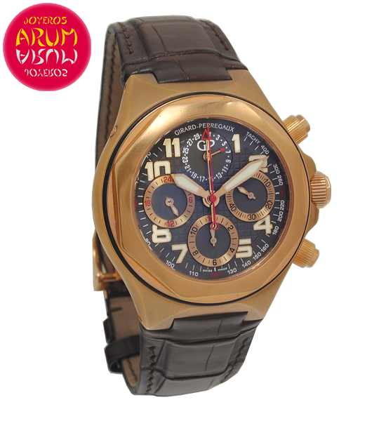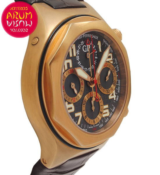 Other specifications :calibre GP033C0, power reserve 46 hours, chronograph, GMT at nine, date at twelve, small seconds at three, luminous marks, 18K gold folding clasp.