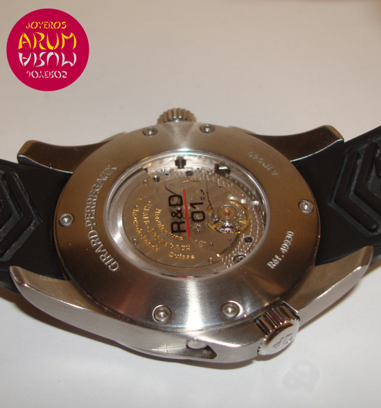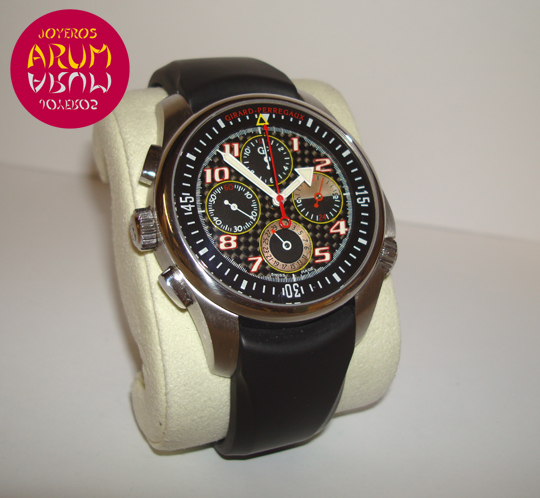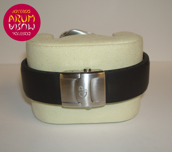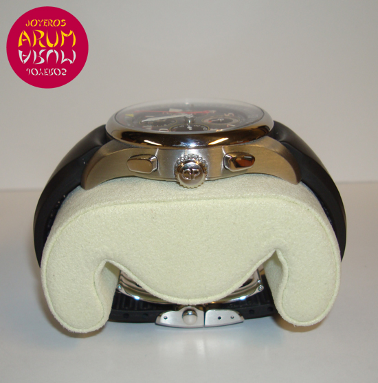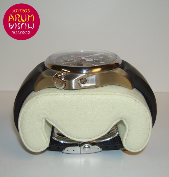 Description :steel, black dial with arabic numbers, sapphire crystal, automatic movement, 4 indicators on the dial, date at nine, chronograph, luminescence, crown and pushers on the left and right auxiliary crown, diameter 42 mm, 30 meters underwater, transparent back, rubber strap, steel folding clasp.