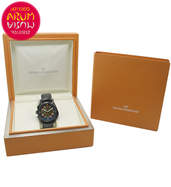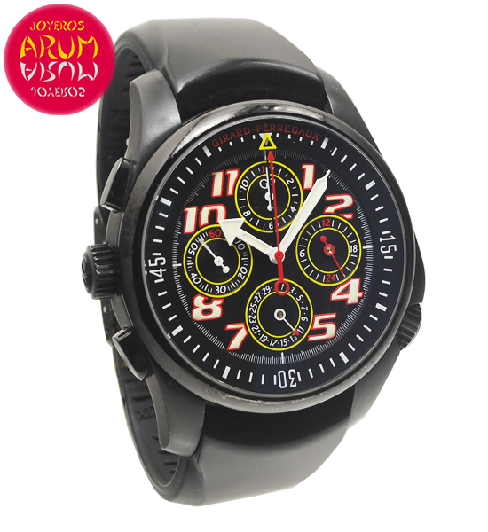 Other specifications :limited edition 249 pieces (140/249), PVD steel, ceramic bezel, calibre GP033C0, power reserve 46 hours, chronograph, GMT at three, date at six, small seconds at nine, luminous marks, auxiliary crown at right. Year 2008.