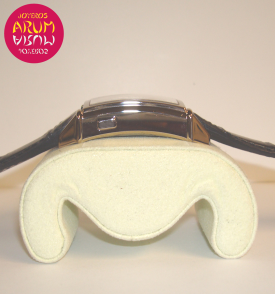 Description :white gold, black dial, smooth bezel, sapphire crystal, automatic movement, chronograph, GMT function at twelve, (second time zone), small seconds at three, hour indicator at six, minute indicator at nine, date between four and five, auxiliary button at left, transparent caseback, diameter 31.9 mm by 31.5 mm, waterproof 30 meters, black leather strap, white gold folding clasp.