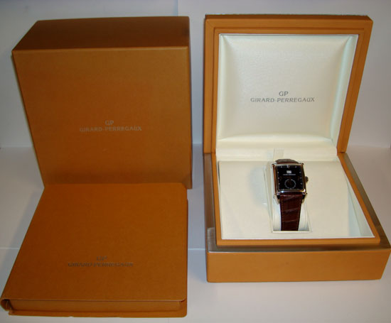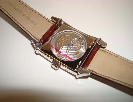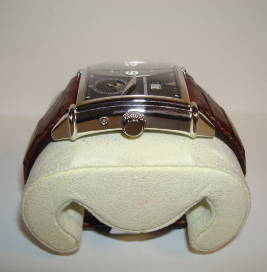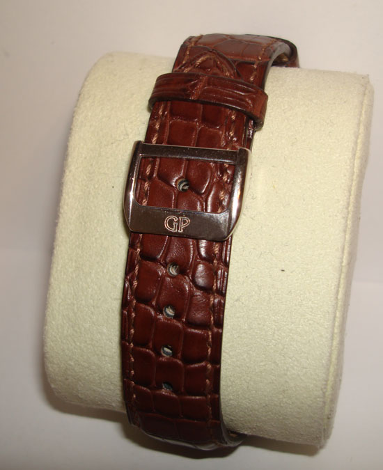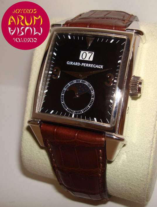 Description :white gold, black dial, sapphire crystal, automatic movement, small seconds, moon phase, date, screw crown, transparent caseback, 32 by 48 mm diameter, water resistant 30 meters, black leather strap, folding clasp.