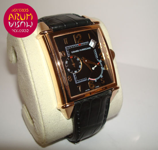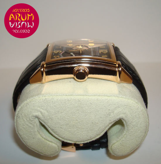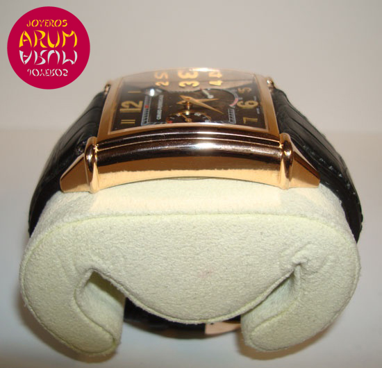 Description :pink gold, black dial, sapphire crystal, automatic movement, small seconds at nine, date between one and two, power reserve indicator, screw crown, diameter 32 mm, transparent caseback, 30 meters underwater, black leather strap, pink gold folding clasp.