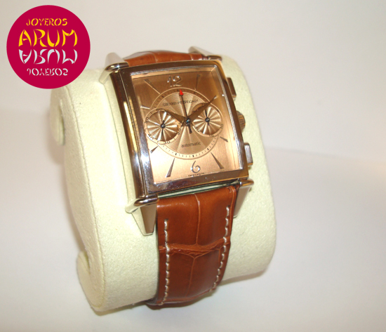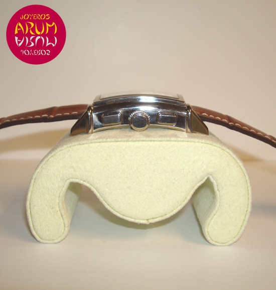Description :white gold, champagne dial, smooth bezel, sapphire crystal, automatic movement, chronograph, two indicators on the dial, seconds and minutes, screw crown and two buttons at right, 30 mm diameter, 30 meters underwater, brown leather strap, buckle closure.