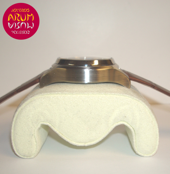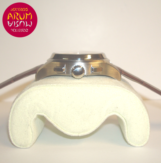 Description :steel, cream dial, smooth bezel, gild numbers, blued steel hands and gild, sapphire crystal, automatic movement, chronograph rattrapante, two indicators on the dial, small seconds at three, two buttons and crown at right, 38 mm diameter, brown leather strap, buckle closure.