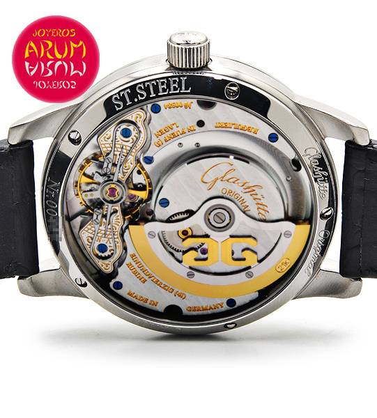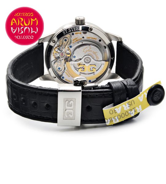 Other specifications :caliber GUB90, fixed smooth bezel, small seconds at six, date window, transparent caseback, sapphyre glass in both sides, rotor gold 21K, strap and folding clasp Glashutte.
