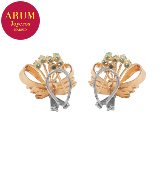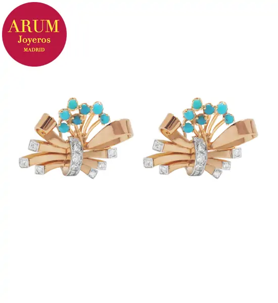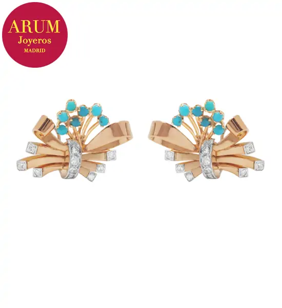 Product: Gold EarringsShop Reference: RAI70Description: Earrings made in 18K rose gold with diamonds and turquese. Weight 8,24 grs.Size: 2,3 cmCondition: Like new, with box.
