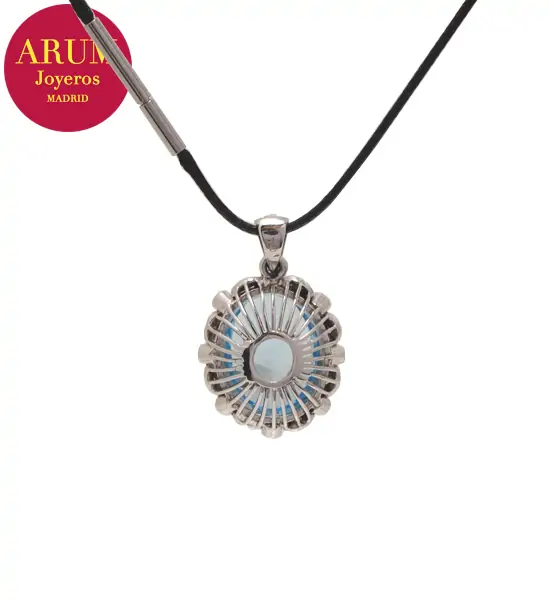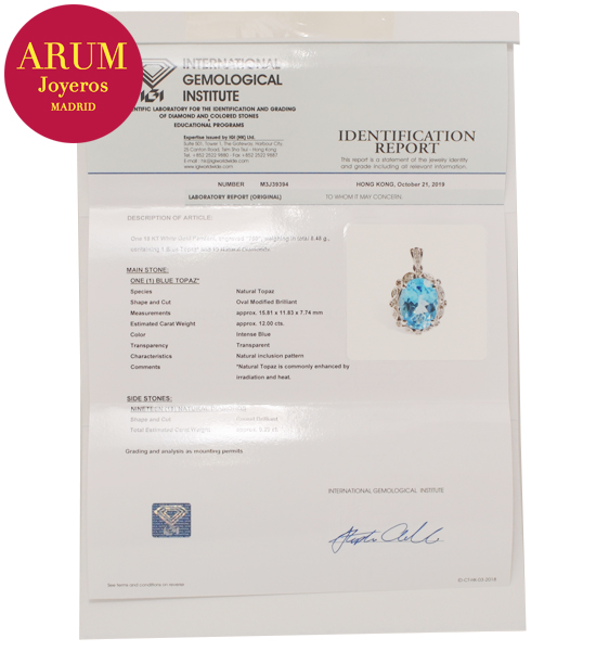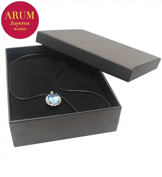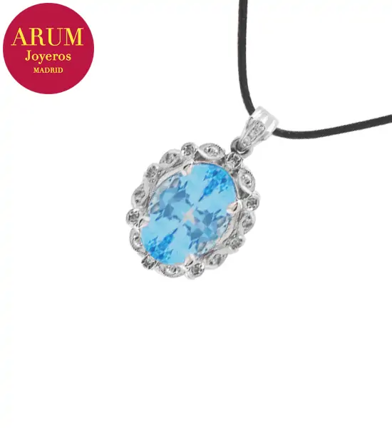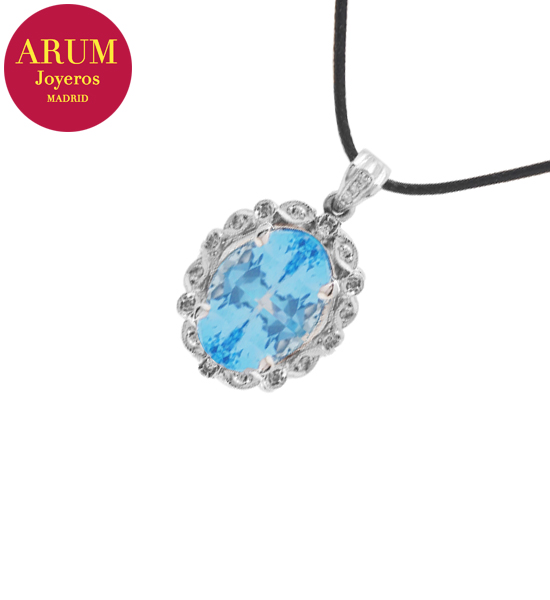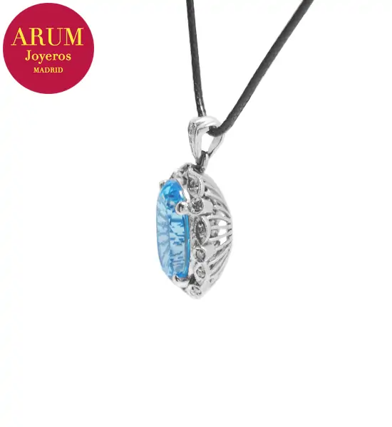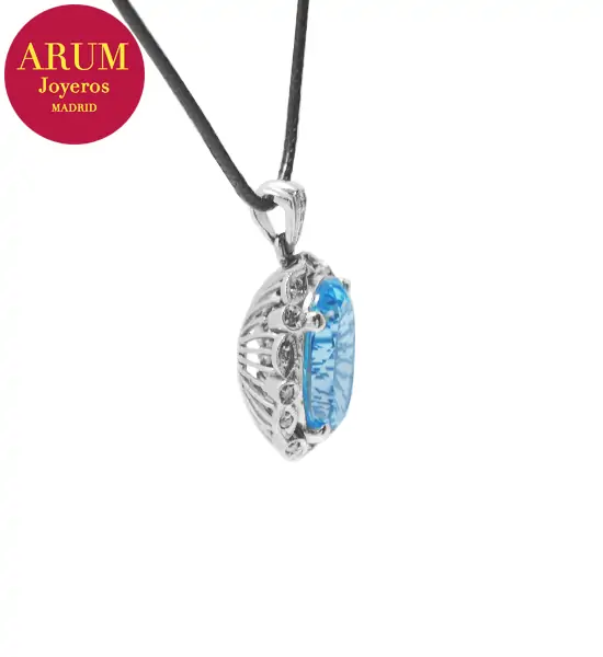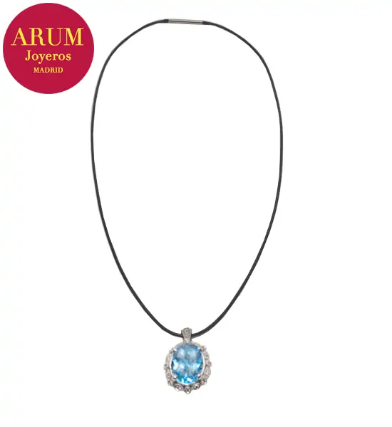 Description: Pendant made in 18K white gold (total weight 6,48 grs.) with a blue topaz (Weight 12,00 ct approx, Measures 15,81 by 11,83 by 7,74 mm, Intense blue colour) and 19 brilliant-cut diamonds (total 0,20 ct). Includes a black leather cord as a 44 cm long chain. The pendant measures 2.7 cm long by 1.7 cm wide.