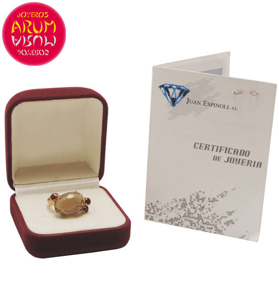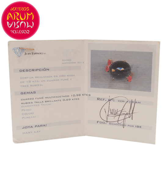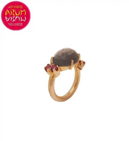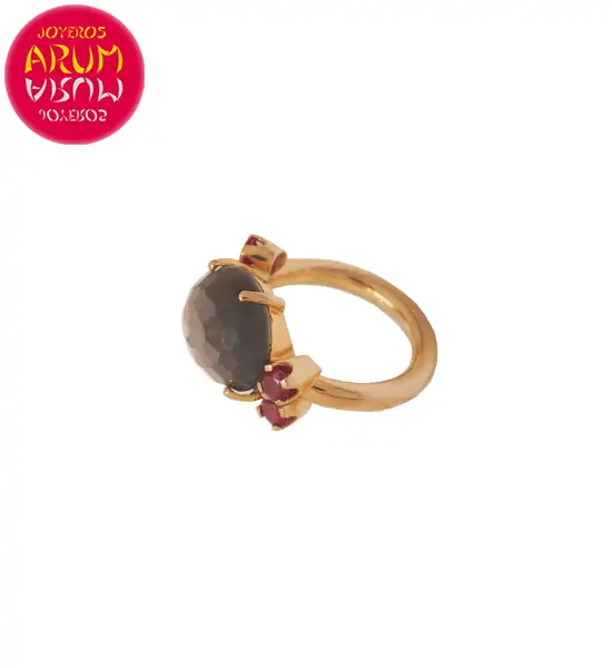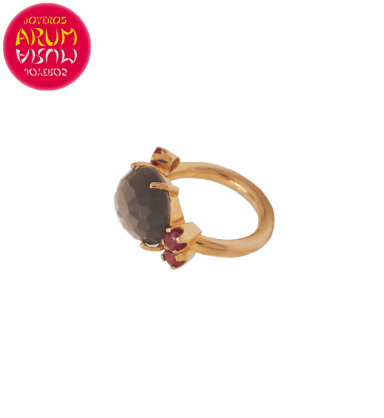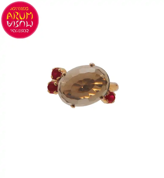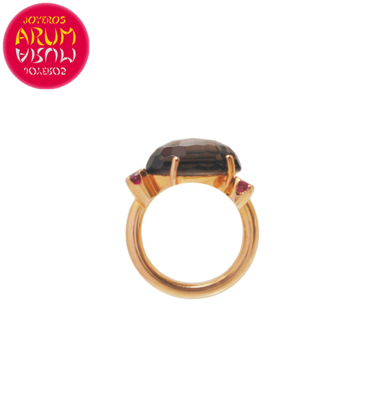 Product: Gold Ring QuartzShop Reference: RAJ1935Description: Ring made in 18K rose gold with fume quartz 10.98 ct and three ruby 0.69 cts.Size:52Condition: Like new, with box and certificated.