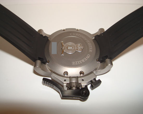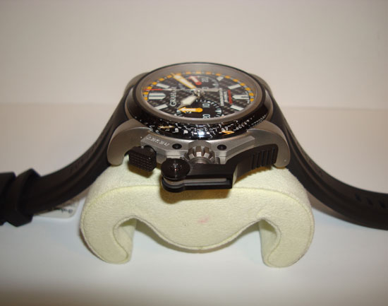 Description :titanium, black dial, sapphire crystal, automatic movement, chronograph, two indicators on the dial, seconds and minutes, crown and pushers on the left, luminescence, waterproof 100 meters, diameter 46 mm (without crown), rubber strap, buckle closure.