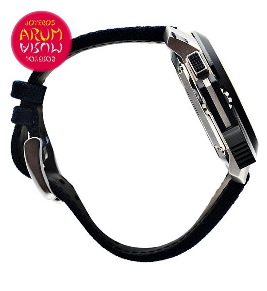 Other specifications :calibre G1747, ceramic bezel, chronograph, telemeter, small seconds at three, minute counter at six, date at eight, start button with carbon fiber, crown at left, luminiscence marks, transparent caseback, year 2013.