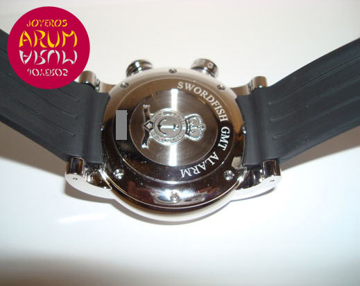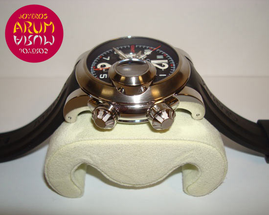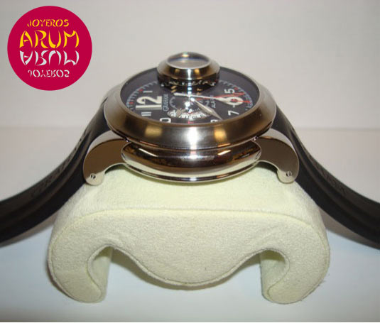 Description :steel, black dial with arabic numbers, sapphire crystal, automatic movement, GMT function (dual time), power reserve indicator, power reserve of 42 hours, alarm clock, date with magnifying glass, waterproof 100 meters, luminescence dial and handles, diameter 45 mm, two crowns at right, rubber strap, buckle closure.