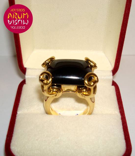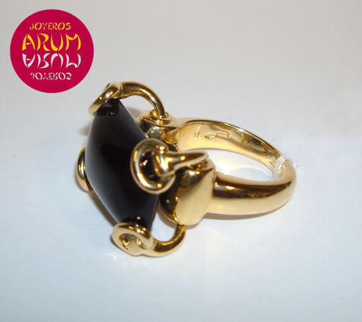Product: Gucci RingReference: ARUM-GON1Description: Yellow gold ring 18 K, with smooth black onyx cabochon Size 16. Signed.