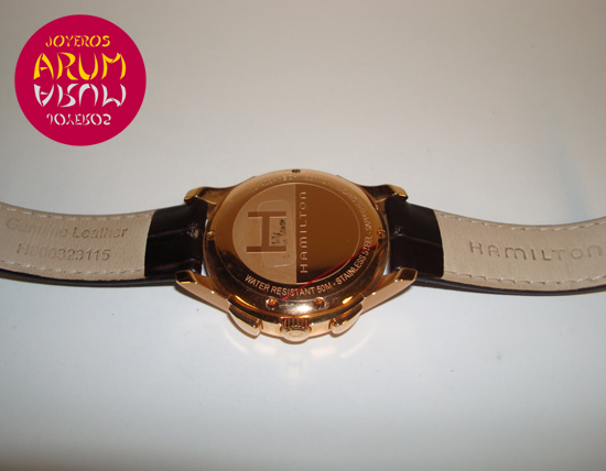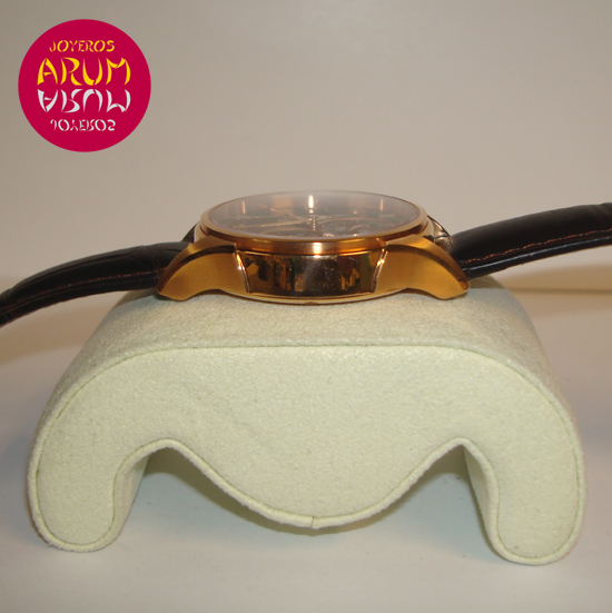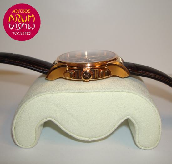 Description :gild steel, sapphire crystal, quartz movement, chronograph, small seconds at six, minute and hour indicator, handles and luminescent dial, diameter 36 mm, 50 meters underwater, brown leather strap, buckle closure.