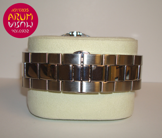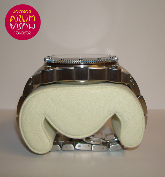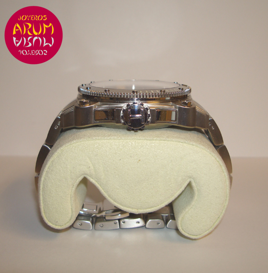 Description :steel, black dial, sapphire crystal, automatic movement, chronograph, two indicators on the dial, seconds and hours, date and day of week at three, handles and luminescent numbers, crown and two buttons at right, transparent back , diameter 46 mm, waterproof 200 meters, steel strap, hidden folding clasp, year 2011.