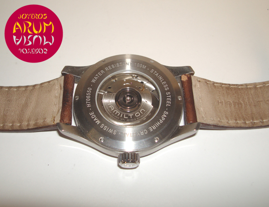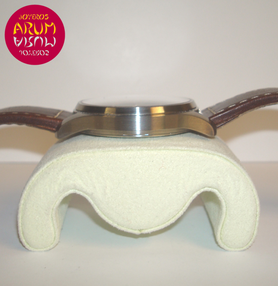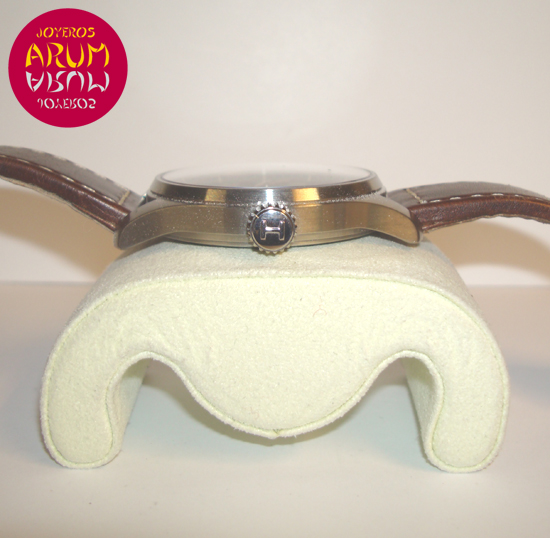 Description :steel, black dial, fixed smooth bezel, sapphire crystal, automatic movement, luminescent handles and numbers, small seconds at six, date at three, right at crown, transparent cover, diameter 44 mm, waterproof 100 meters, brown leather strap, steel buckle closure.