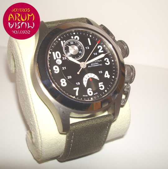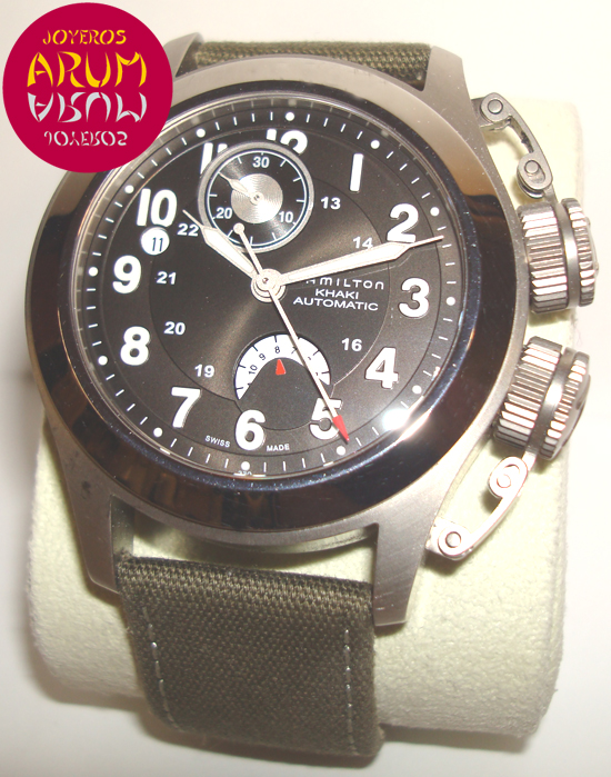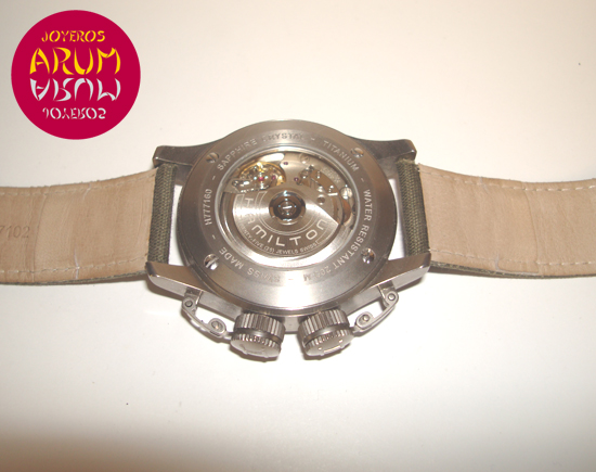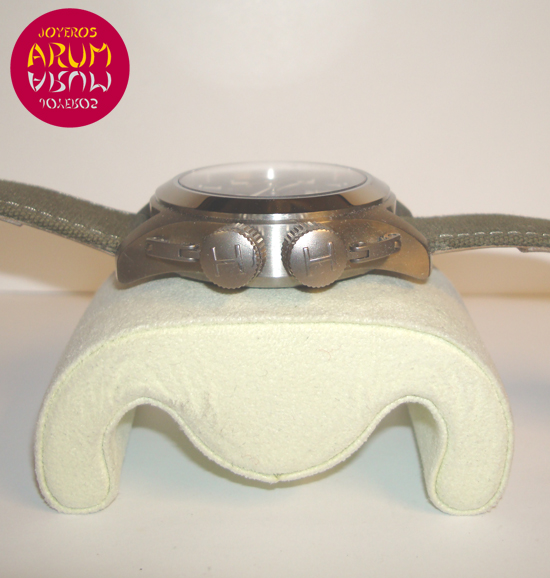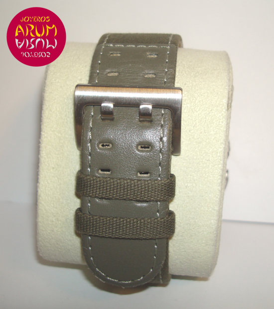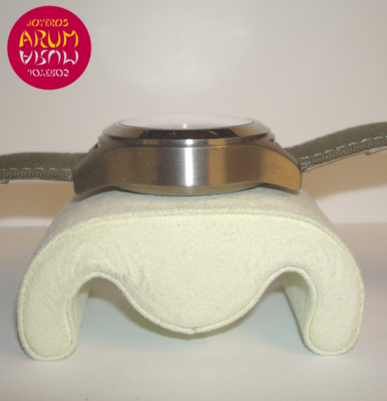 Description :titanium, black dial, fixed smooth bezel, sapphire crystal, automatic movement, chronograph, minutes indicator between eleven and twelve, display of hours between five and six, date between nine and ten, handles and luminescent dial, two crowns at right with protectors, transparent caseback, diameter 43 mm, waterproof 200 meters, green leather strap, steel buckle closure.