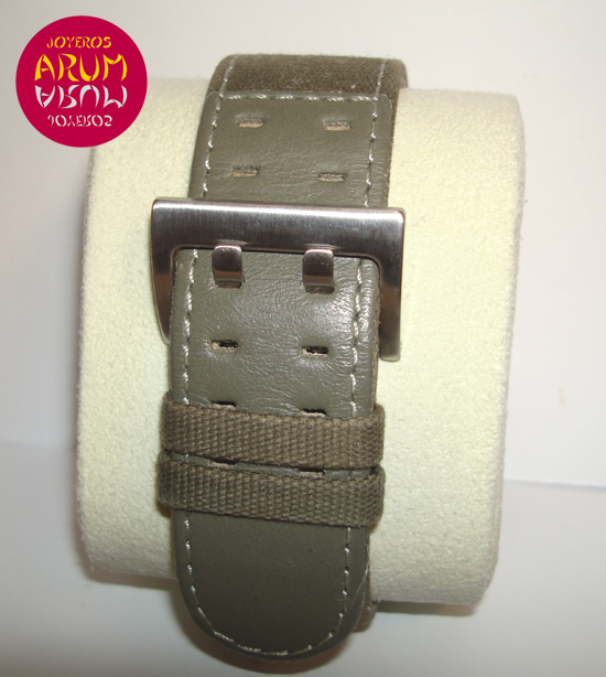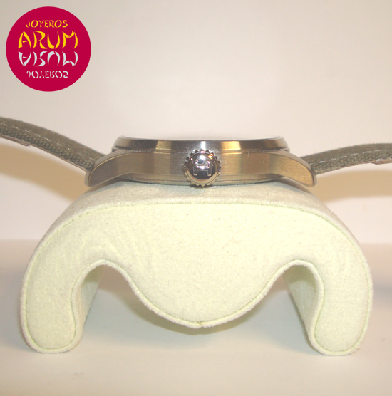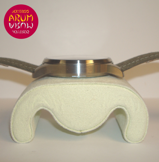 Description :steel, black dial with arabic numbers, fixed bezel, sapphire crystal, hand manual movement, caliber ETA 6497, handles and luminescent dial, small seconds at nine, right crown, caseback with window, diameter 44 mm, waterproof 100 meters, green leather strap, steel buckle closure.