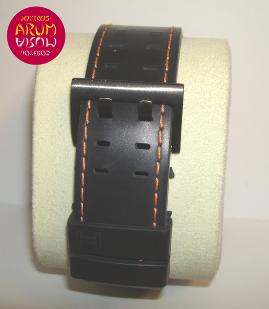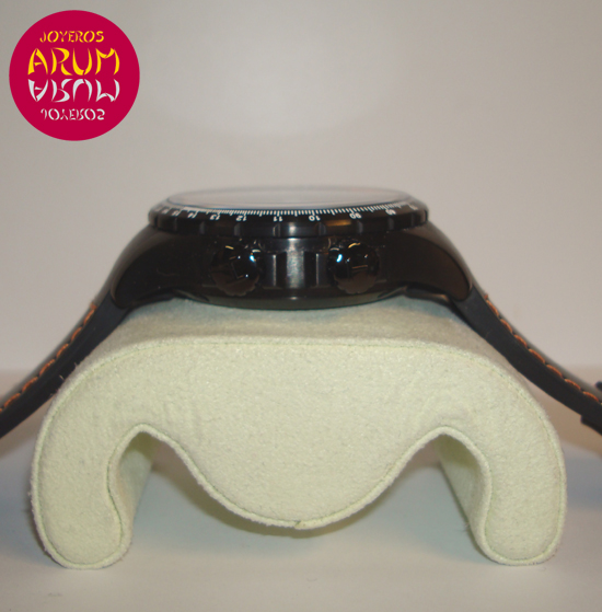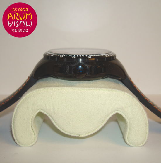 Description :limited to 2000 pieces, black steel, black dial, bidireccional rotating bezel, sapphire crystal, automatic movement, caliber Valjoux 7750, chronograph, hour indicator at twelve, small seconds at three, minutes indicator at six, date and day of the week at three, calculation rules for aviation in inner bezel, two crowns on the right to use aviation functions, screw crown and two buttons to the left to the normal functions of time, date and chronograph, handles and luminescent dial, transparent case back, diameter 44 mm, waterproof 100 meters, rubber strap, buckle closure.
