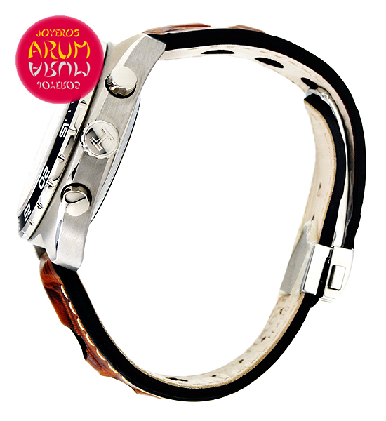 Other specifications :limited edition 1971 pieces, calibre H31, rotating bezel, chronograph, tachymeter, date at six, small seconds at nine, luminiscence marks, screw crown.