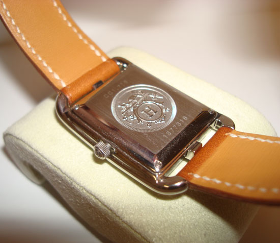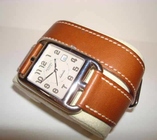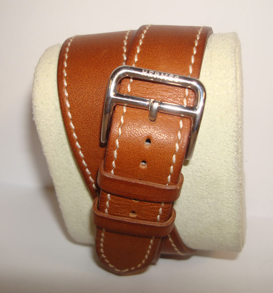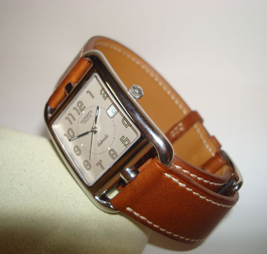 Description :steel, sapphire crystal, automatic movement, center seconds, luminescent numbers and in handcuffs, diameter 29 mm – 29 mm, date at three, two brown leather strap, buckle closure with the anagram of Hermes engraving.