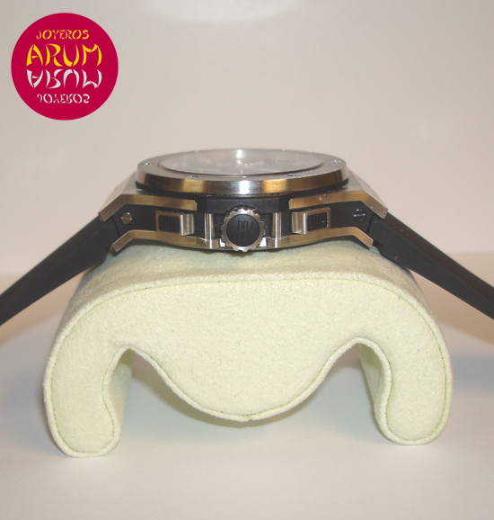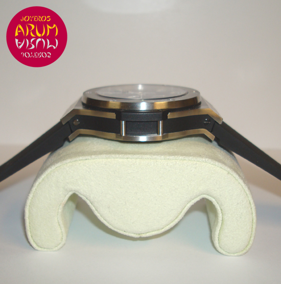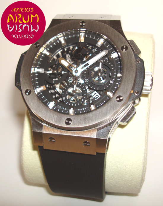 Description :steel, dial skeleton, screwed bezel, sapphire crystal, automatic movement, power reserve of 42 hours, chronograph, three indicators on the dial, seconds, minutes and hours, date between four and five, crown and two buttons at right, diameter 44 mm, waterproof 100 meters, transparent case back, rubber strap, black steel folding clasp.