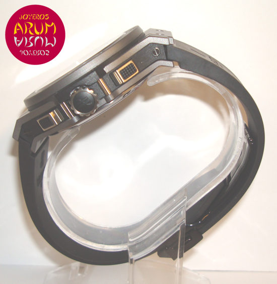 Description :tantalium and titanium, sapphire crystal, screw bezel, automatic movement, chronograph, three indicators on the dial, seconds, minutes, hours, date between four and five, screw crown and two buttons with protective rubber, transparent caseback, water resistant 100 meters, diameter 44 mm, rubber strap, folding clasp.
