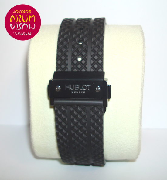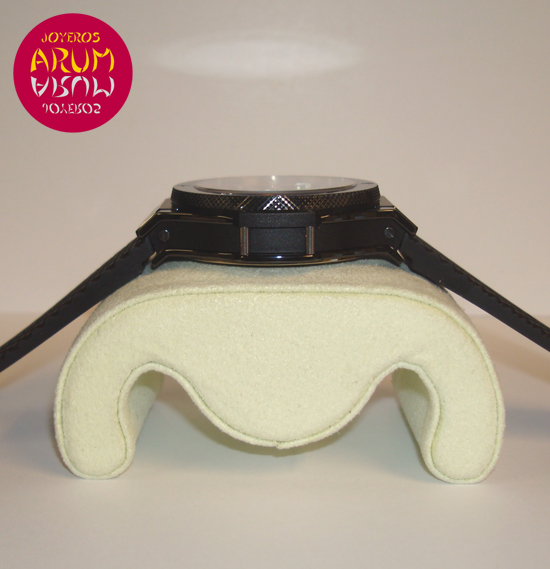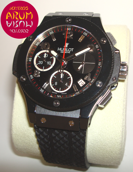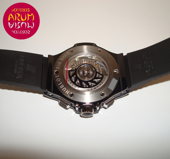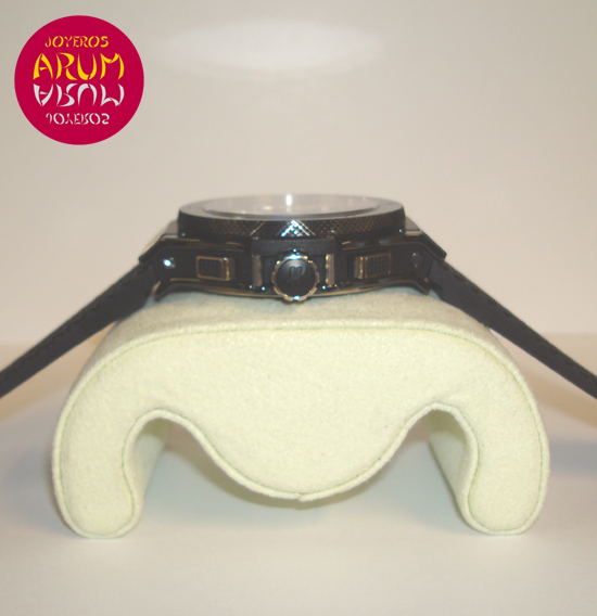 Description :titanium and ceramic, screwed bezel, sapphire crystal, automatic movement, power reserve of 42 hours, caliber HUB44, chronograph, three indicators on the dial, seconds, minutes and hours, date between four and five, crown and two buttons at right, diameter 41 mm, waterproof 100 meters, transparent case back, rubber strap, folding clasp.