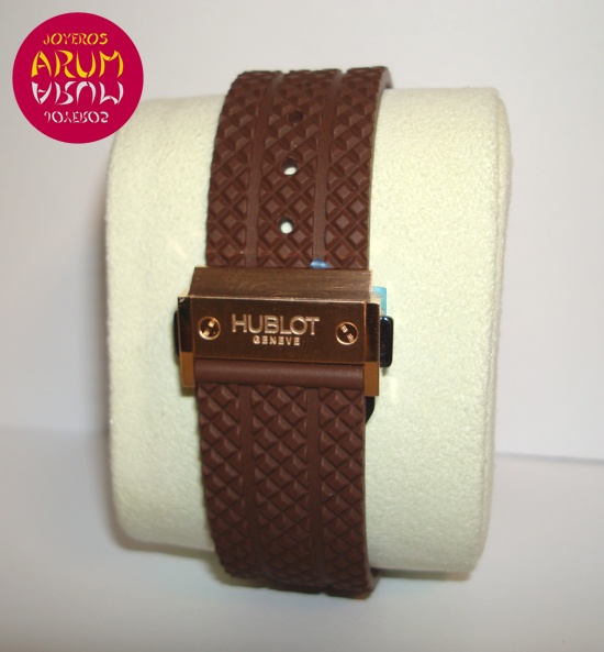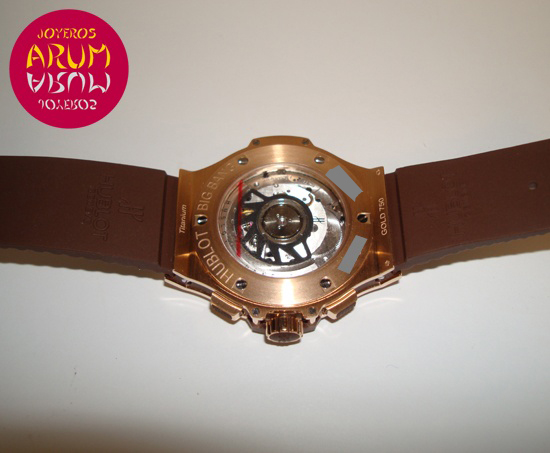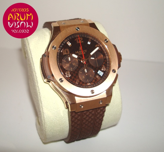 Description :pink gold, brown dial with arabic numbers, screw bezel , sapphire crystal, automatic movement, chronograph, three indicators on the dial, seconds, minutes, hours, date between four and five, handles with luminescent indicators, crown and pushers at right with protective rubber, diameter 41 mm, waterproof 100 meters, transparent case back, brown rubber strap, folding clasp.