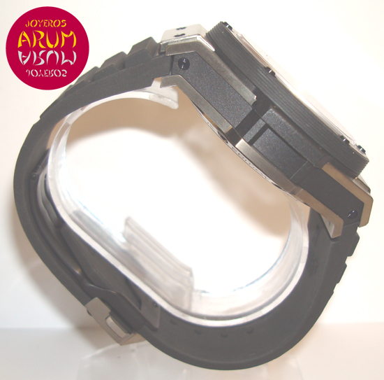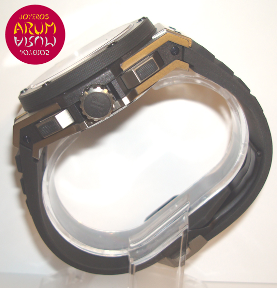Description :limited to 500 pieces, zirconium and titanium, black dial, sapphire crystal, automatic movement, chronograph, two indicators on the dial, minutes and hours, crown and buttons with protective rubber, transparent caseback, diameter 48 mm, waterproof 100 meters, rubber strap, titanium folding clasp.