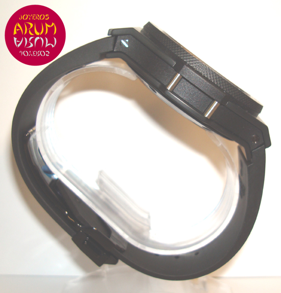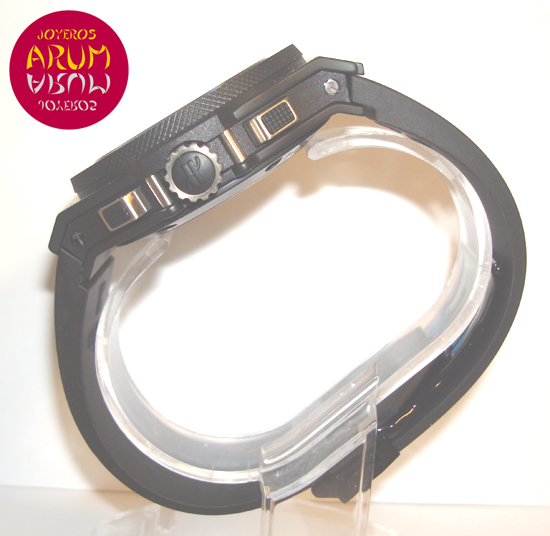 Description :ceramic and titanium, sapphire crystal, screw bezel, automatic movement, chronograph, three indicators on the dial, seconds, minutes, hours, date between four and five, luminiscence indicators, screw crown and two buttons with protective rubber, transparent caseback, water resistant 100 meters, diameter 44 mm, rubber strap, folding clasp.