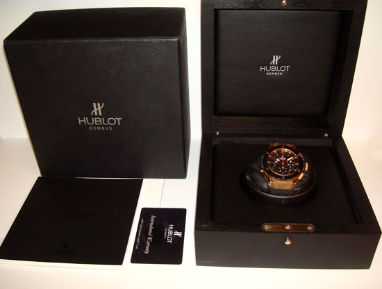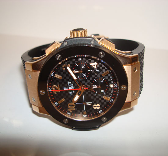 Description :pink gold and titanium, sapphire crystal, screwed ceramic bezel, automatic movement, chronograph, date between four and five, luminescent handles, crown and push buttons with protective rubber, waterproof 100 meters, diameter 44.5 mm, transparent back cover, rubber strap, folding clasp.