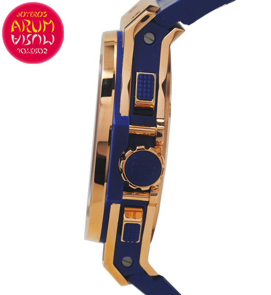 Other specifications :chronograph, date between four and five, small seconds at three, screw bezel, transparent caseback, 18K rose gold folding clasp.