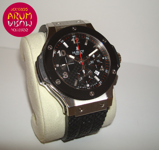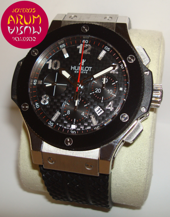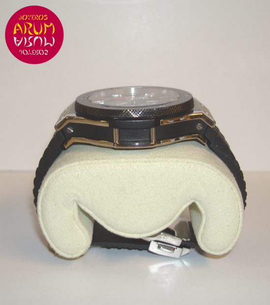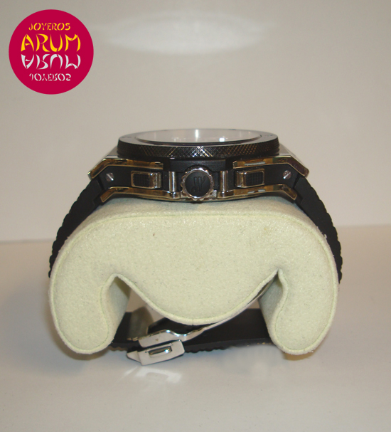 Description :steel, ceramic bezel, sapphire crystal, automatic movement, chronograph, three indicators on the dial, seconds, minutes, hours, date between four and five, dial and handles with lumniscent indicators, crown and two buttons at right, diameter 44 mm, 100 meters waterproof, transparent caseback, rubber strap, folding clasp in steel, year 2011.
