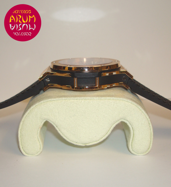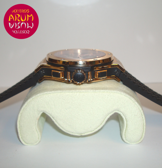Description :rose gold, ceramic and titanium, black dial with arabic numbers, screw bezel, sapphire crystal, automatic movement, caliber HUB44, power reserve of 42 hours, chronograph, three indicators on the dial, seconds, minutes, hours, date between four and five, handles with luminescent indicators, kevlar and gold crown, diameter 44 mm, 100 meters waterproof, transparent back showing the skeletonized rotor, black rubber strap, steel PVD folding clasp and rose gold. Chosen “Watch of the Year Awards 2005” in Japan. First design award in the prestigious “Grand Prix Horlogerie Geneva” 2005 in Switzerland (Geneva Best Design 2005).