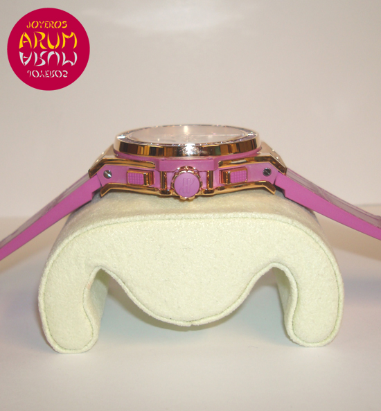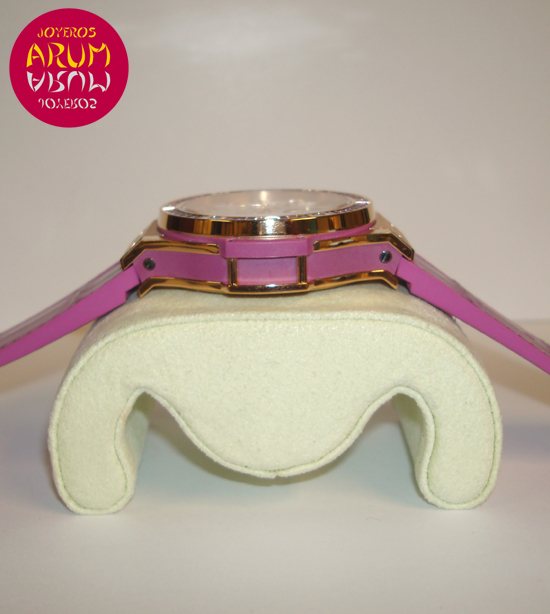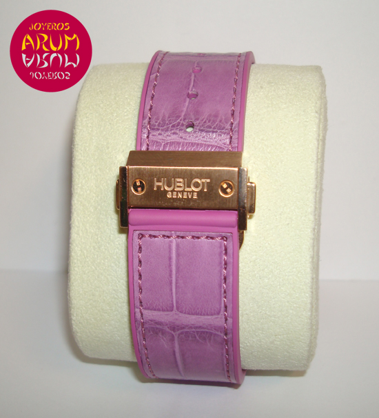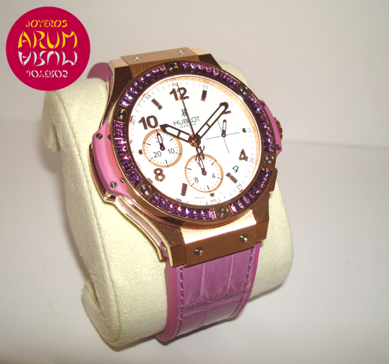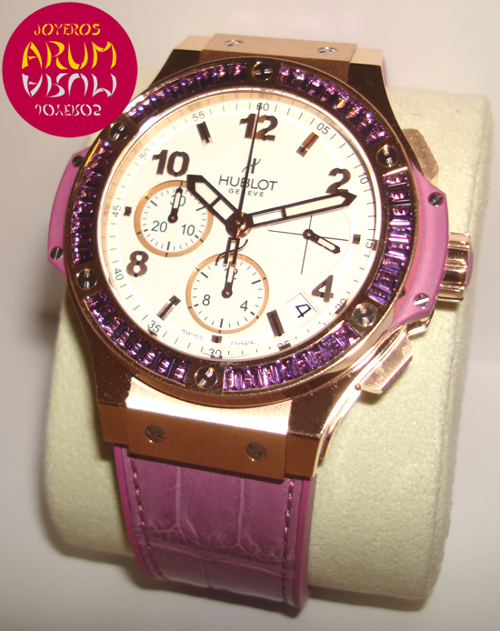 Description :pink gold, white dial with arabic numbers, bezel with 48 baguettes amethyst, sapphire crystal, automatic movement, caliber HUB4300, power reserve of 42 hours, chronograph, three indicators on the dial, seconds, minutes and hours, date between four and five, diameter 41 mm, 100 meters waterproof, transparent back, purple rubber bracelet, folding clasp.