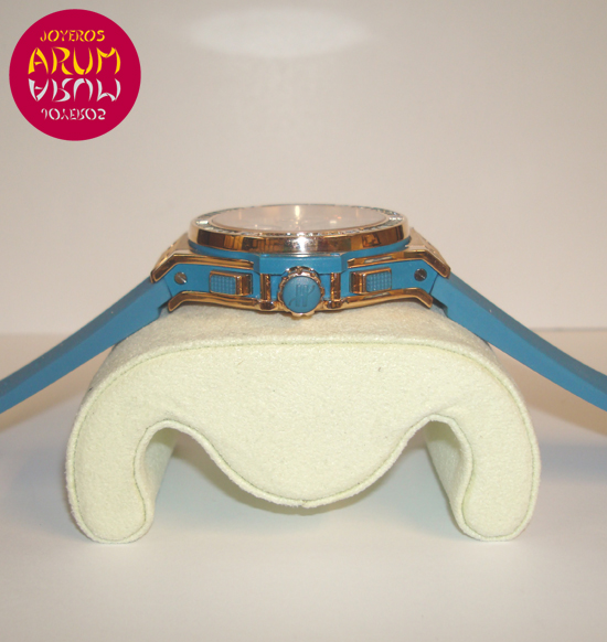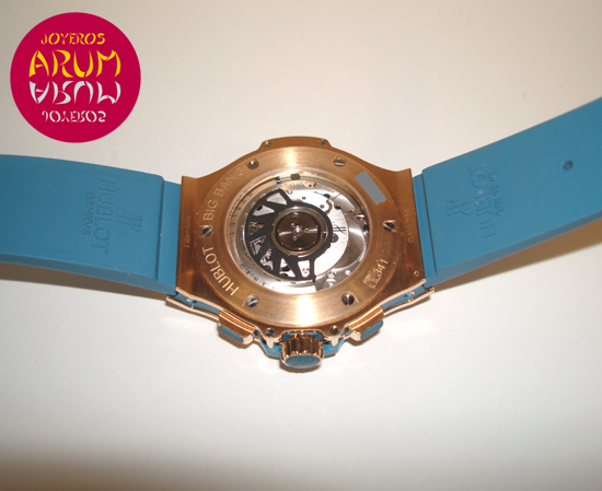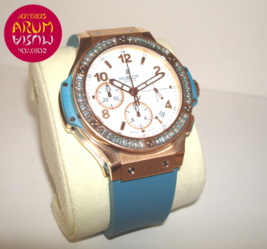 Description :pink gold, white dial with arabic numbers, bezel with 48 baguettes topaz, sapphire crystal, automatic movement, caliber HUB41, power reserve of 42 hours, chronograph, three indicators on the dial, seconds, minutes and hours, date between four and five, diameter 41 mm, 100 meters waterproof, transparent back, blue rubber bracelet, folding clasp in steel PVD and rose gold.