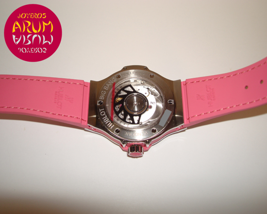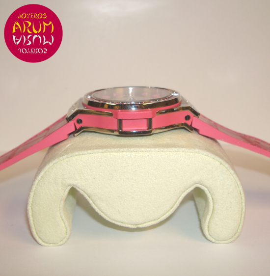 Description :steel, bezel decorated with amethyst baguettes, sapphire crystal, mirror on the dial, automatic movement, central seconds, pink dial, date at three, 41 mm diameter, 100 meters waterproof, protective rubber crown, transparent back, pink leather strap, steel folding clasp.