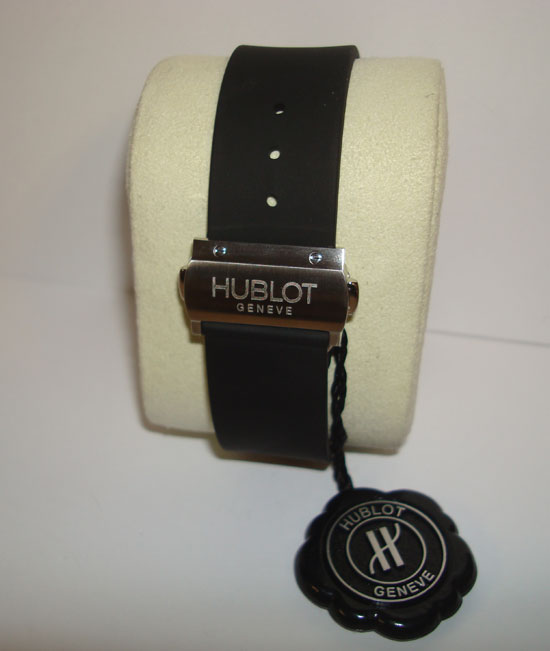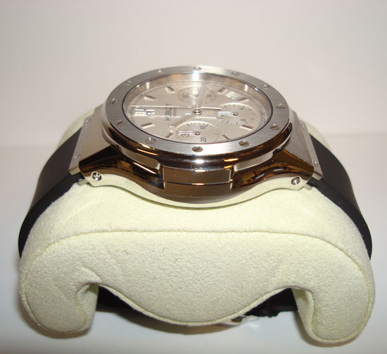 Description :steel, white dial without numbers, screw bezel, sapphire crystal, automatic movement, chronograph, three indicators on the dial, seconds, minutes, hours, date between four and five, crown and push buttons with protective rubber screw, diameter 42 mm, transparent caseback, rubber strap, steel folding clasp.