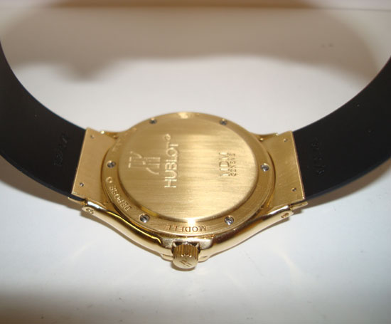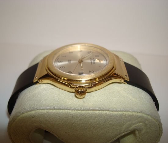 Description :yellow gold, sapphire crystal, automatic movement, gray sphere with arabic numerals, center seconds, luminescent handles indicators, date at three o’clock, screw crown, waterproof 50 meters, diameter 36 mm, rubber strap, yellow gold folding clasp.