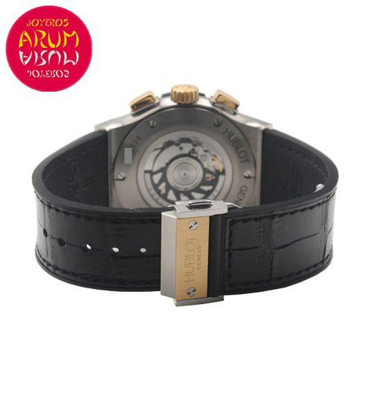 Other specifications :calibre HUB1143, power reserve 42 hours, 18K pink gold, chronograph, date at six, small seconds at three, transparent caseback. Year 2016.